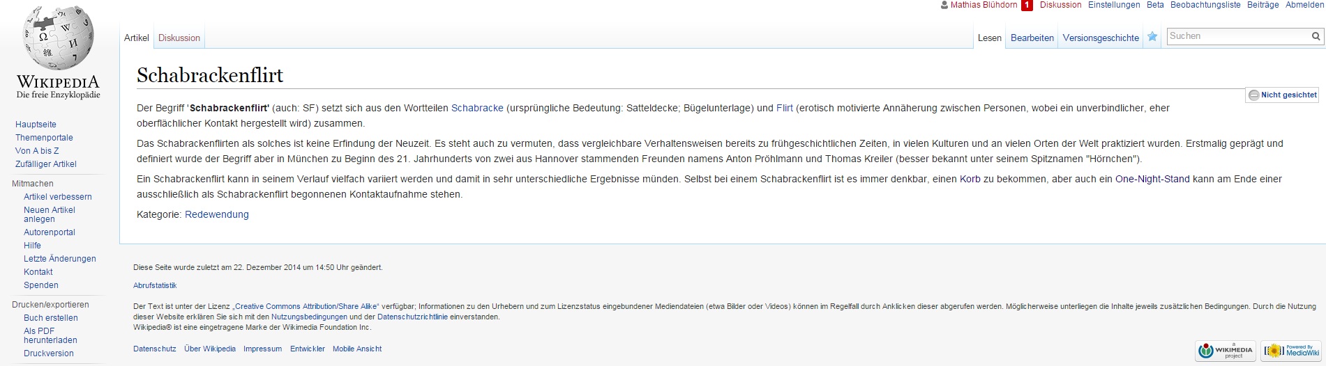 Findet ihr nicht auch, dass Wikipedia mit wertvollen neuen Beiträgen zum allgemeinen Wortschatz fürsorglicher umgehen sollte? Bereits wenige Minuten nach Erstellung meines Eintrags zum Thema „Schabrackenflirt“ (jaaaa, das kommt halt auch im Buch vor) wurde dieser von der Wiki-Polizei als „Unfug“ klassifiziert und gesperrt. Schade! So hätte das Ganze aussehen können:
